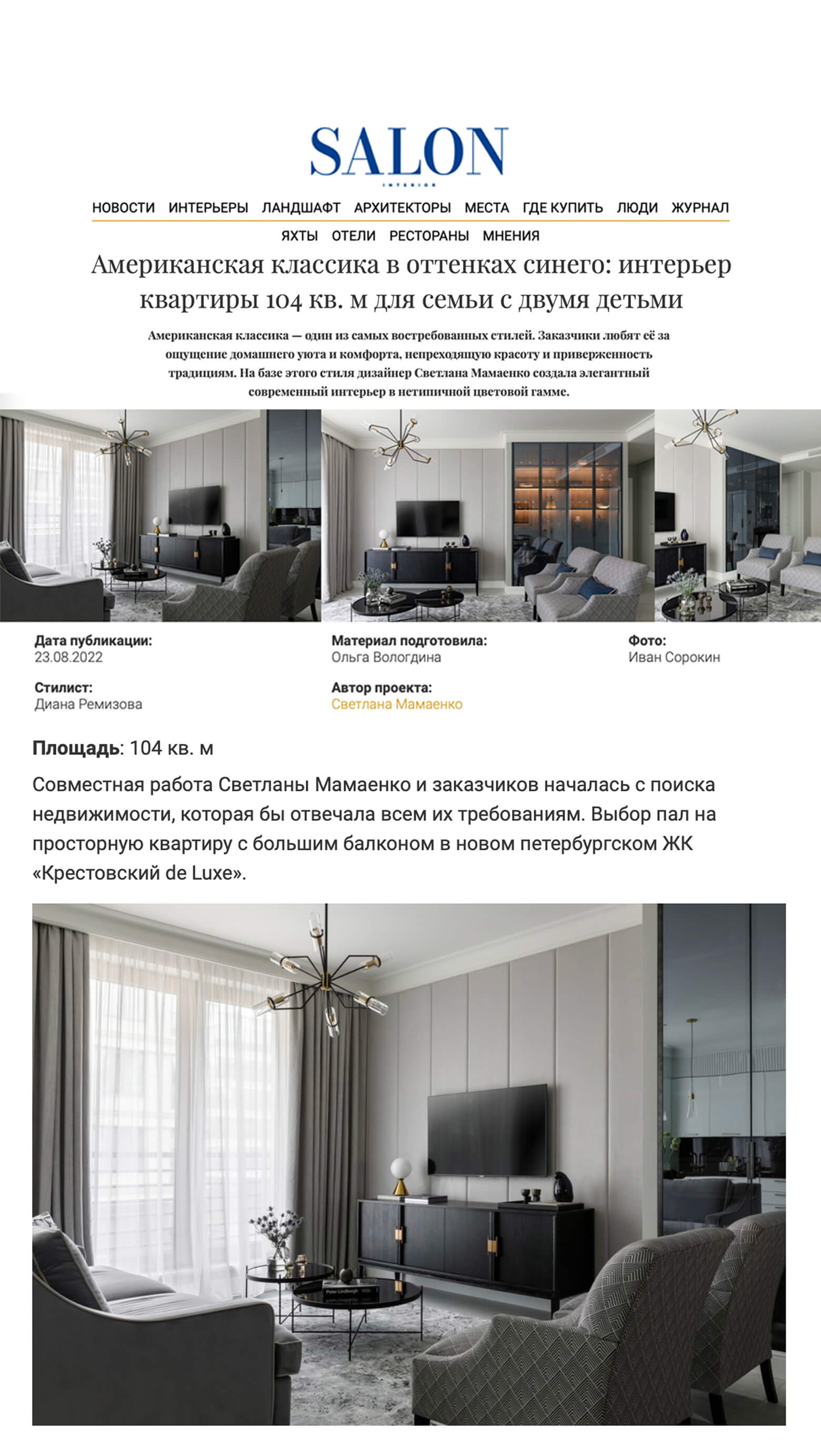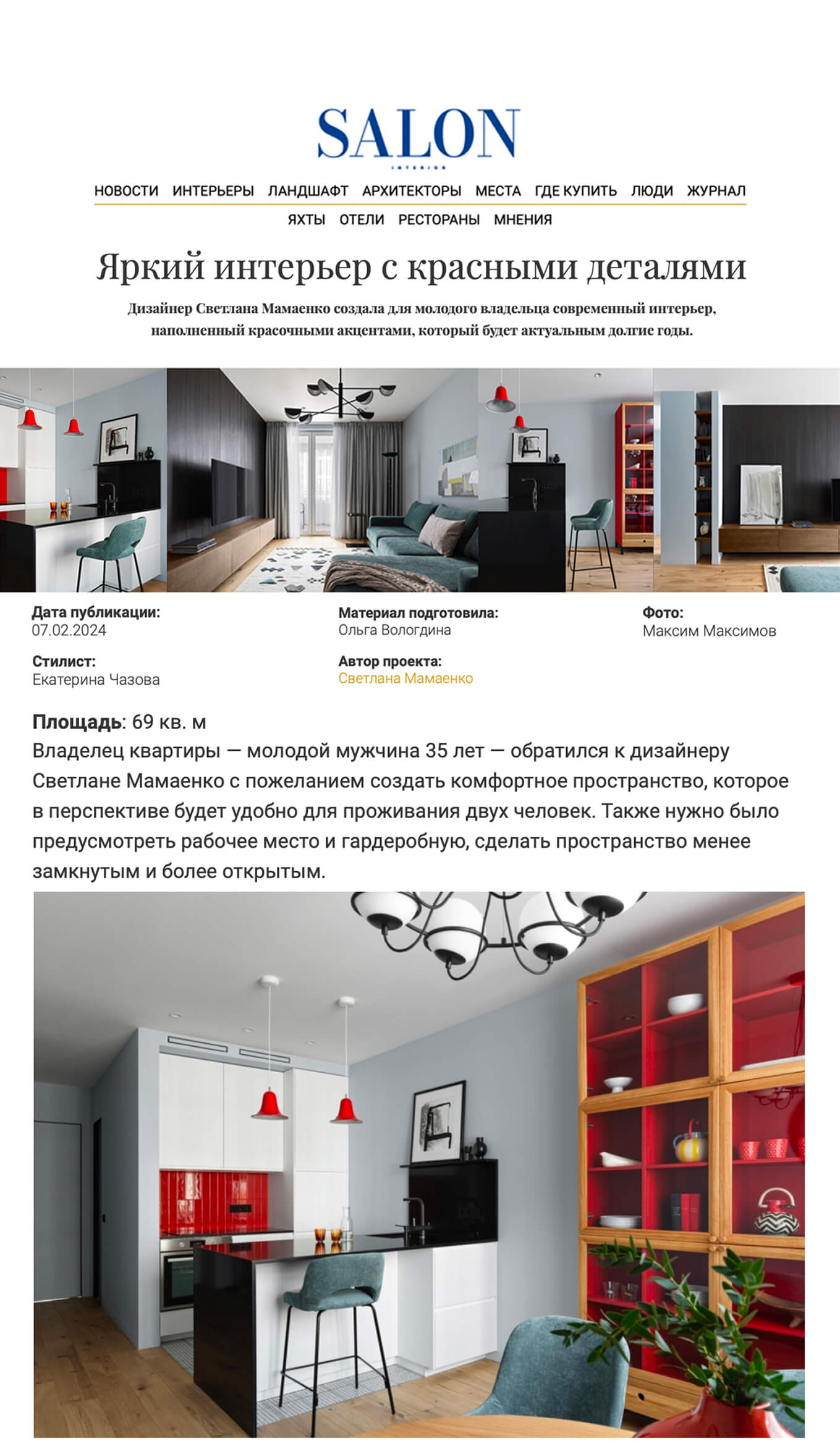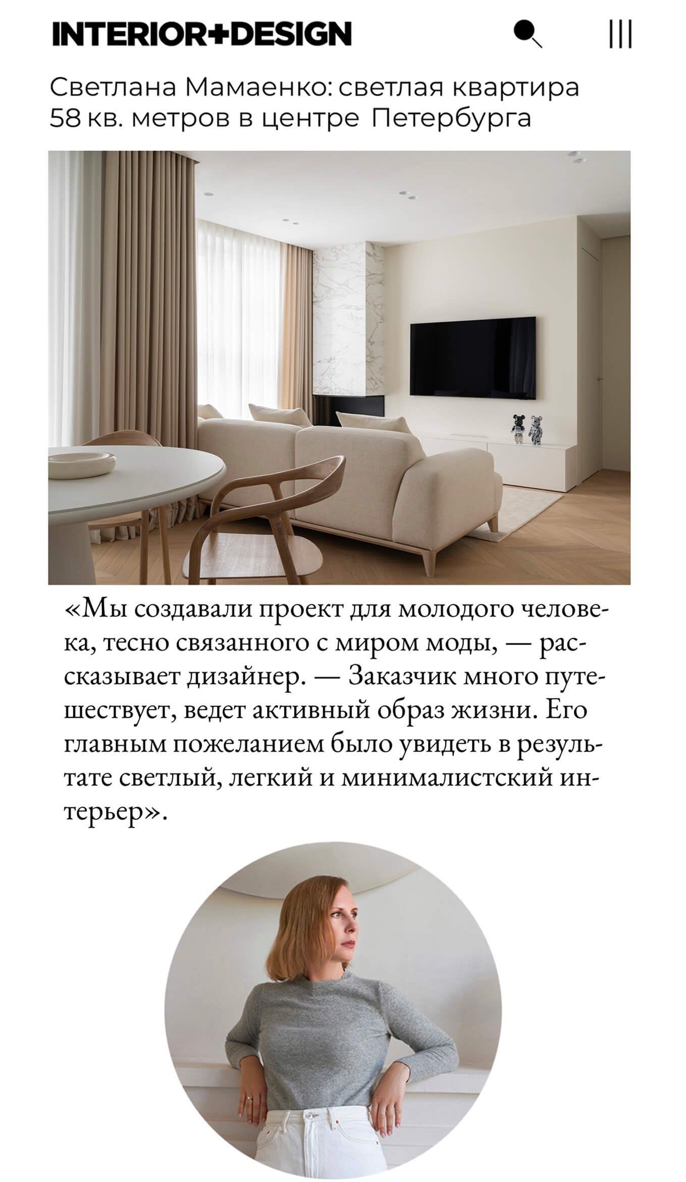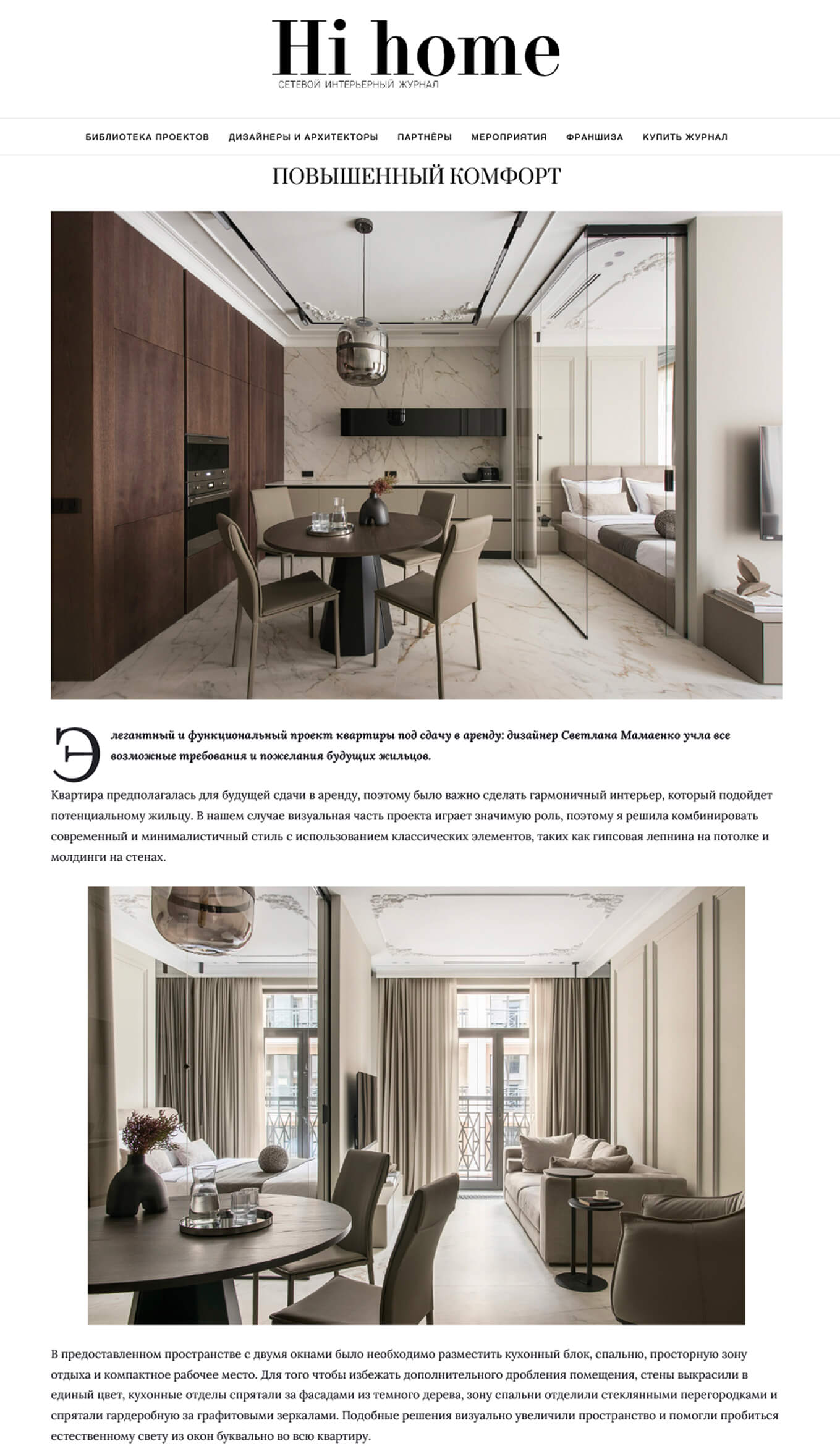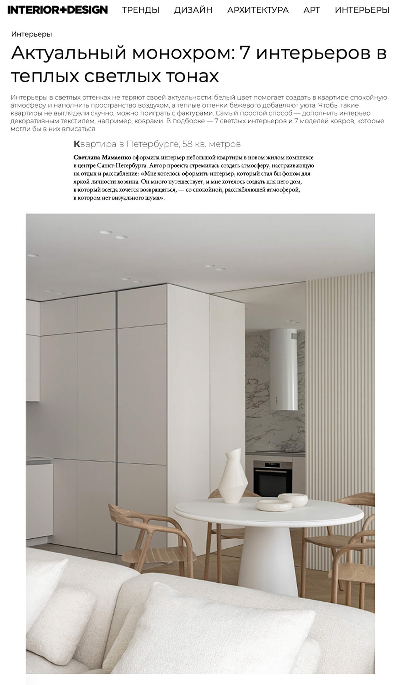 Благодаря системному подходу и высокому уровню реализации, наши проекты неоднократно публиковались в ведущих профильных изданиях: Elle Decoration, Interior + Design, Salon, Design Mate.
