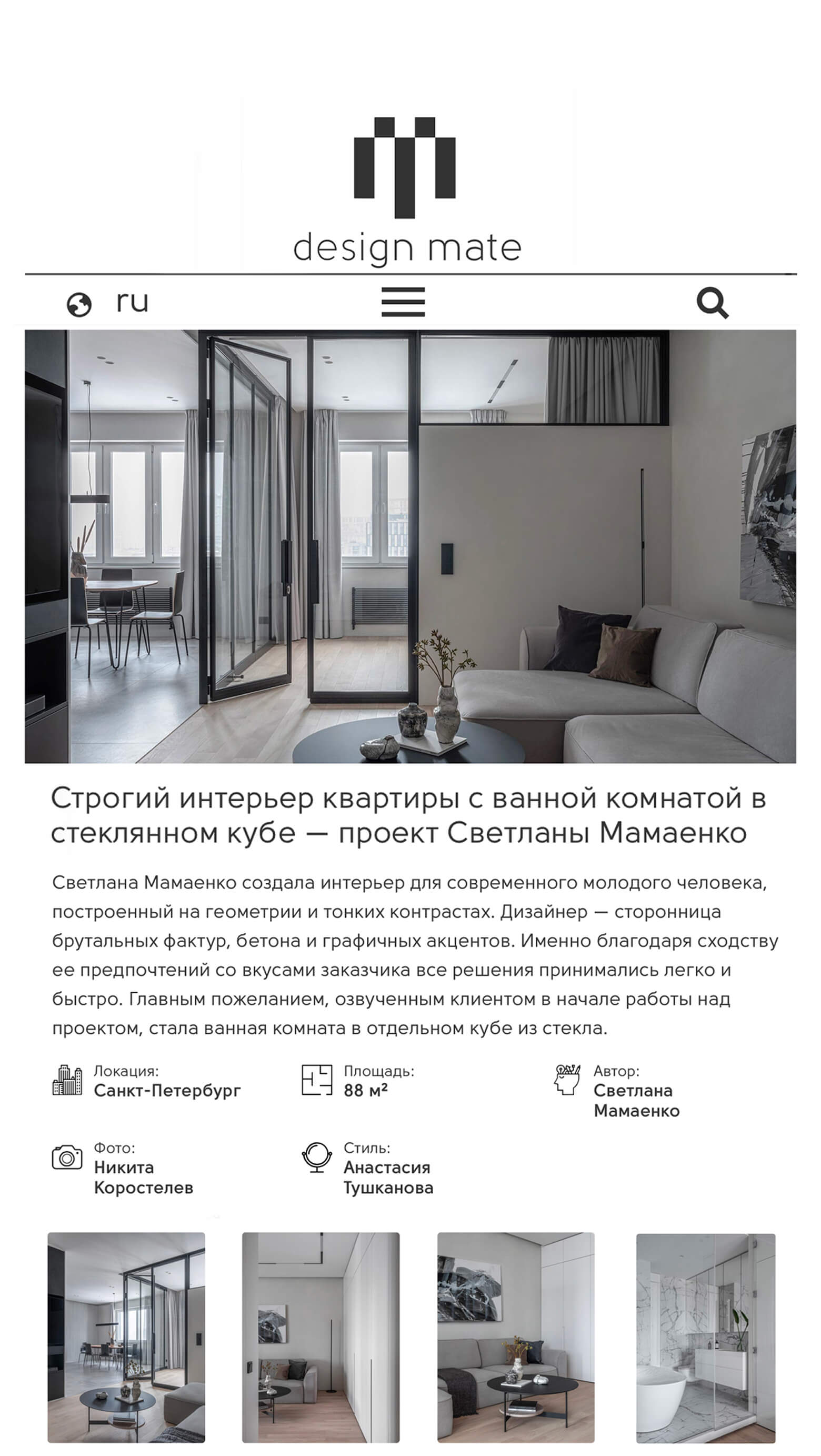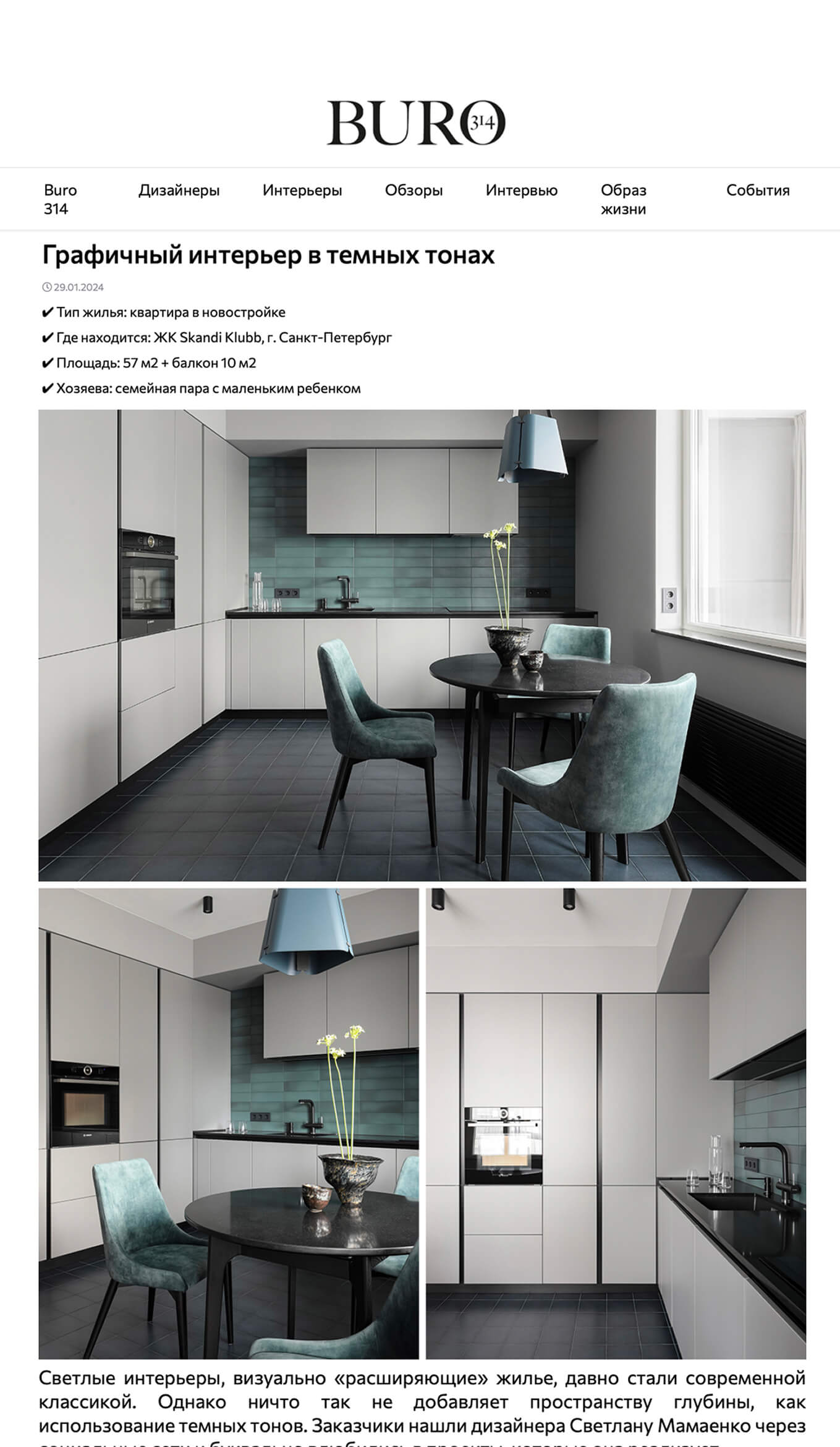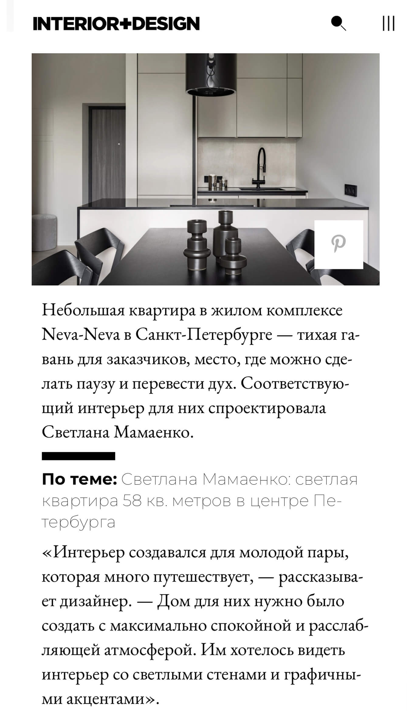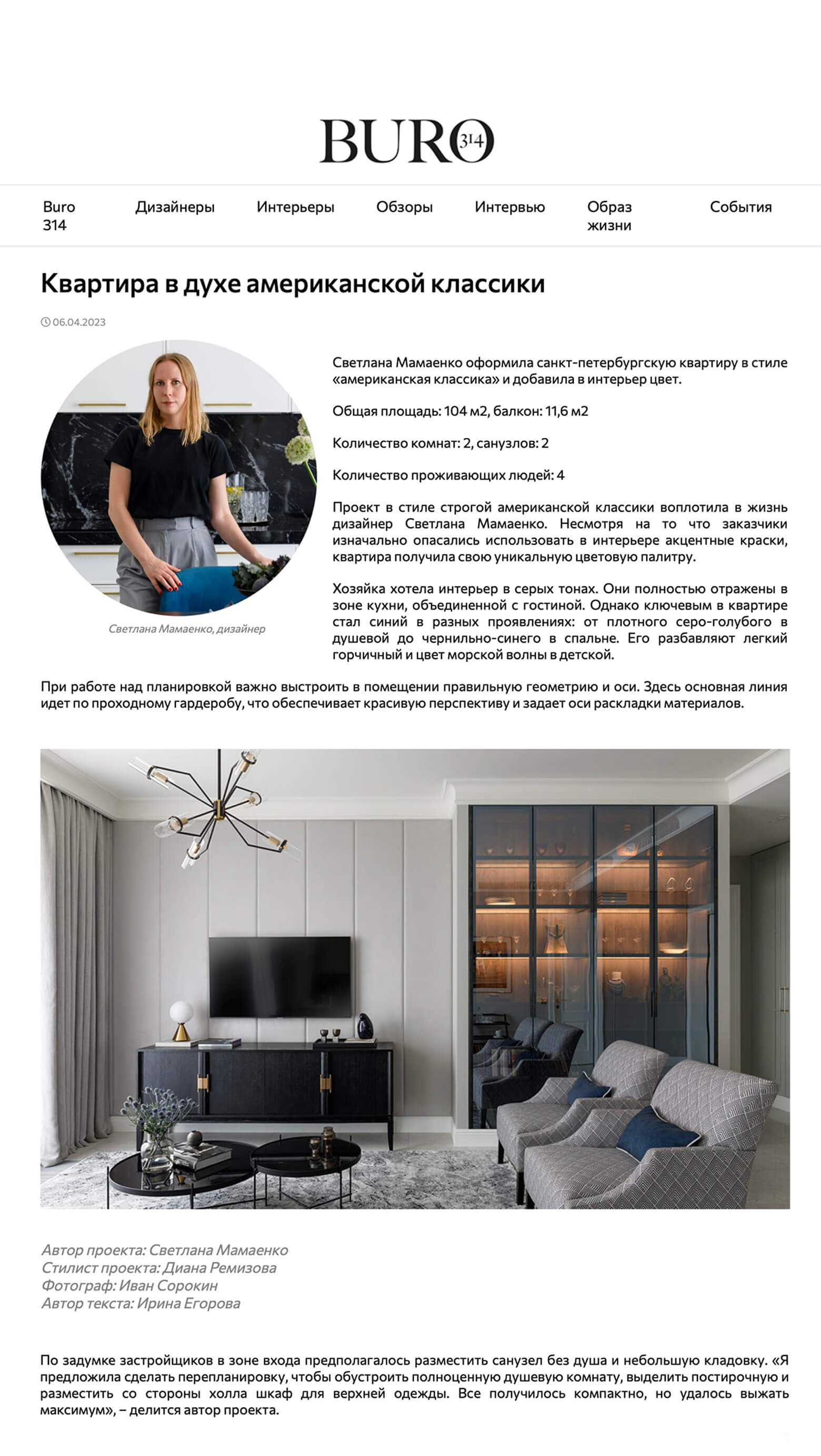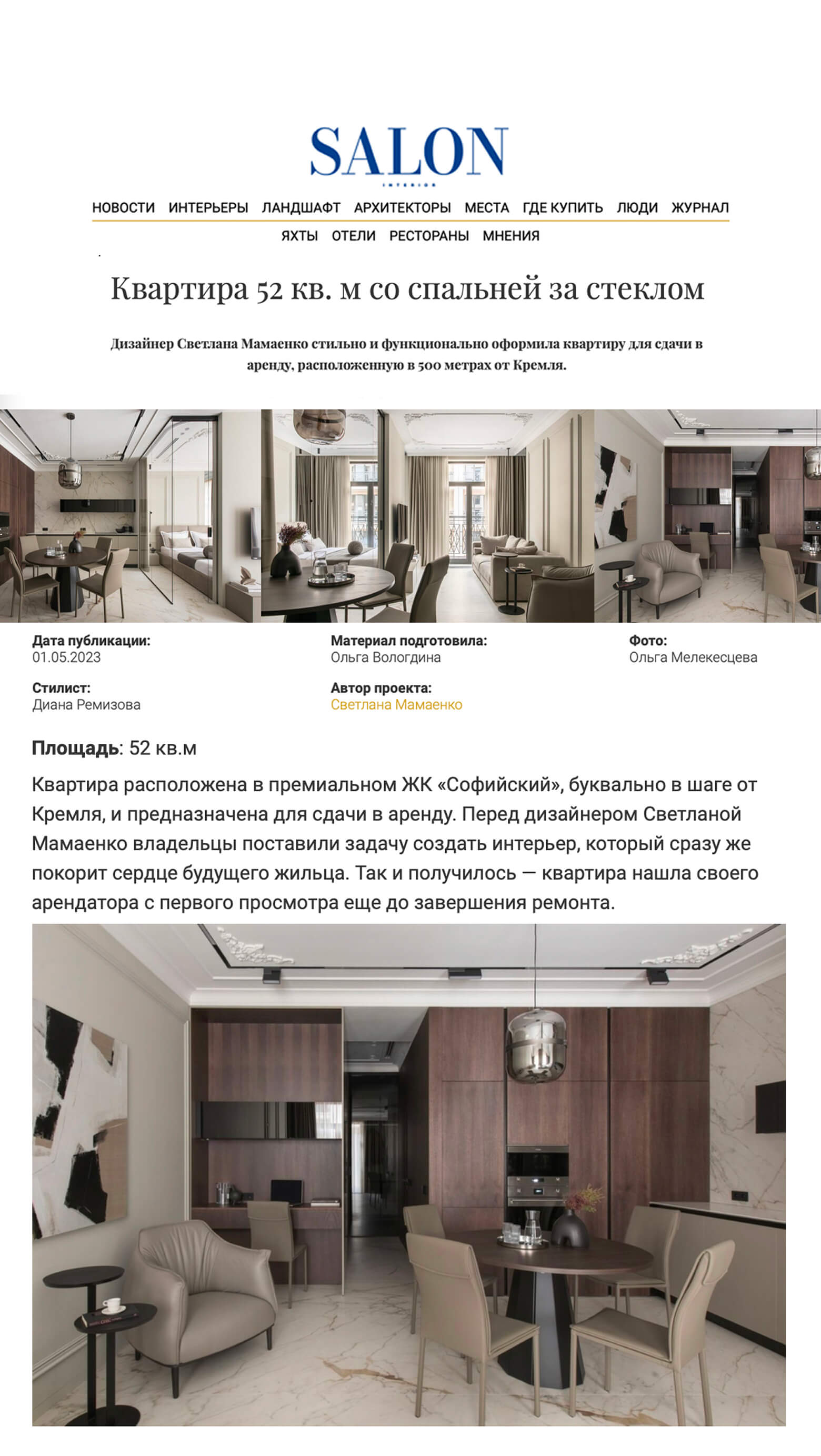 Благодаря системному подходу и высокому уровню реализации, наши проекты неоднократно публиковались в ведущих профильных изданиях: Elle Decoration, Interior + Design, Salon, Design Mate.
